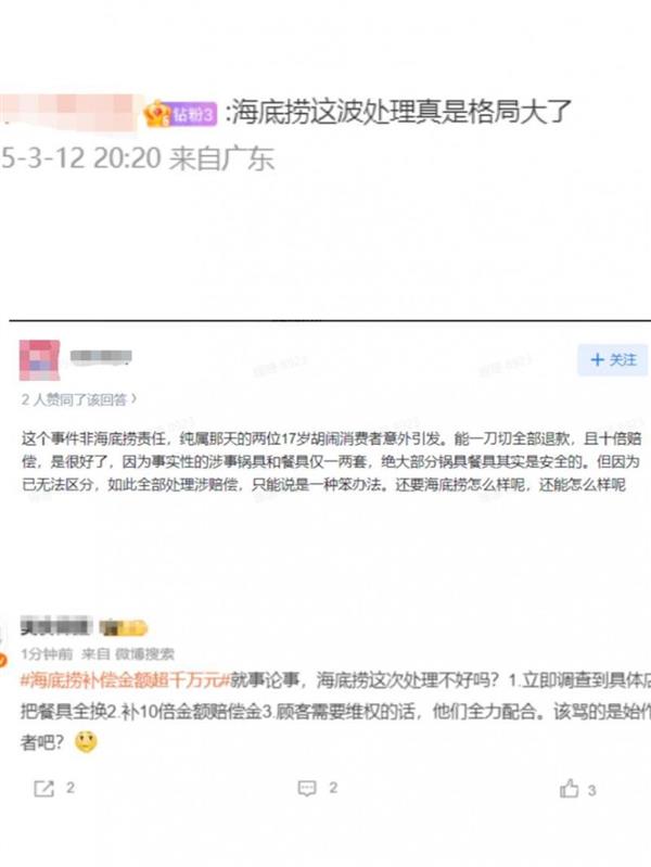 海底捞的诚意及立场获得了一众网友的点赞和承认;网友纷纷暗示要涉事人,企业以及其他消费者的权益。