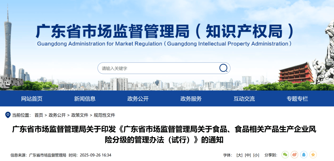 东省市场监视办理局关于印发《广东省市场监视办理局关于食物、食物相关产物出产企业风险分级的办理法子(试行)》的通知。第一条 为强化食物、食物添加剂(以下统称食物)、食物相关产物出产企业食物平安风险分级取信用风险分类办理,优化监管资本设置装备摆设,实施科学无效监管,落实食物平安义务,按照《中华人平易近国食物平安法》及其实施条例、《食物出产运营监视查抄办理法子》(国度市场监视办理总局令第49号)、《食物相关产质量量平安监视办理暂行法子》(国度市场监视办理总局令第62号)、《市场监管总局关于推进企业信用风险分类办理进一步提拔监管效能的看法》(国市监信发〔2022〕6号)等相关,连系本省现实,制定本法子。第二条 本法子所称风险分级办理,是指市场监视办理部分分析食物、食物相关产物出产企业食物平安风险取通用信用风险,动态确定出产企业风险品级,统筹监管使命取监管力量,对分歧风险品级出产企业实施差同化、精准化监视办理。第 本法子合用于本省市场监视办理部分对获得食物出产许可证的食物出产企业以及获得工业产物出产许可证的食物相关产物出产企业(以下统称出产企业)实施风险分级办理。第四条 省市场监视办理部分担任制定全省出产企业风险分级办理轨制,对市级市场监视办理部家声险分级办理工做进行指点和查抄。市级市场监视办理部分担任组织实施本行政区域出产企业风险分级办理工做,对本行政区域出产企业风险分级办理工做进行指点和查抄。第七条 市、县(区)级市场监视办理部分该当连系出产企业食物平安静态风险峻素、动态风险峻素取通用信用风险峻素,确定出产企业风险品级,并动态调整。食物平安静态风险峻素包罗企业出产的食物、食物相关产物类别、行业规模、食(使)用人群等环境;食物平安动态风险峻素包罗出产企业出产前提连结、出产过程节制、办理轨制运转等环境;通用信用风险峻素包罗出产企业根本属性消息、企业动态消息、监管消息、联系关系关系消息、社会评价消息等环境。出产企业风险品级从低到高划分为、B级、C级、D级四个品级。市场监视办理部分按照监视查抄、监视抽检、行政惩罚、义务约谈、风险监测、举报赞扬等监视办理记实,对出产企业风险品级实施动态调整。第八条 出产企业风险品级采用评分方式进行,以百分制计较。此中,静态风险峻素量化分值为40分,动态风险峻素量化分值为40分,通用信用风险量化分值为20分。量化分值越高,出产企业风险越高。第十条 同时出产多类别食物(食物相关产物)的,确定该出产企业的静态风险品级该当选择风险较高的食物(食物相关产物)类别对应的档次。第十一条 省市场监视办理部分建立静态风险峻素目标系统,连系全省现实环境构成《广东省食物、食物相关产物出产企业静态风险峻素量化分值表》(附件1)。监视查抄发觉《食物出产监视查抄要点表》《广东省食物相关产物出产企业监视查抄记实表》中一般项不合适的,每项次量化打分1分,沉点项不合适的,每项次量化打分5分。每次监视查抄的量化打分笼盖前次监视查抄的量化打分。监视抽检发觉不及格食物、食物相关产物的,每批次量化打分10分,情节严沉的,可酌情添加量化打分至20分。正在后续核查措置中发觉被抽检食物、食物相关产物为冒充或者非出产企业缘由导致不及格的,该当撤销打分。市场监视办理部分根据《中华人平易近国食物平安法》第一百一十四条对出产企业的代表人或者次要担任人进行义务约谈的,正在本法子第十二条根本上,添加风险监测、举报赞扬等动态风险峻素量化打分项目取分值,并正在本行政区域内组织实施。第十四条 出产企业通用信用风险峻素的分值间接利用通用型企业信用风险分类成果,具体分值通过企业通用信用风险分值(总分1000分)按照50!1折算。第十五条 出产企业静态风险峻素量化分值、动态风险峻素量化分值和通用信用风险峻素量化分值之和,为出产企业风险分值。按照出产企业风险分值确定风险品级,为;风险分值之和为30(不含)—45(含)分的,为B级;风险分值之和为45(不含)—60(含)分的,为C级;风险分值之和为60(不含)分以上的,为D级。第十六条 按照《市场监视办理严沉违法失信名单办理法子》被列入严沉违法失信名单的出产企业,间接定为D级。(一)违反食物平安法令律例,且遭到、罚款、违法所得(不法财物)、责令停产破产等行政惩罚的;(七)具有法令、律例、规章、国度市场监视办理部分及广东省市场监视办理部分的其他能够上调风险品级的景象。第十八条 出产企业存鄙人列景象之一的,可正在风险品级评定成果的根本上调低一个品级,但不得低于静态风险峻素和通用信用风险峻素量化分值之和所对应的风险品级:(二)具有法令、律例、规章、国度市场监视办理总局及广东省市场监视办理局的其他能够下调风险品级的景象。出产企业年度风险品级以每年1月1日起至昔时12月31日为一个品级确定年度。市、县(区)级市场监视办理部分按照出产企业上一品级确定年的年度风险品级制定下一年度监视查抄打算。品级确定年度内,出产企业呈现风险分值、风险品级发生变化的,应正在发生变化次月内调整,并按照本法子第二十五条、第二十七条相关,及时加强对风险品级提高的出产企业的监管。第二十
